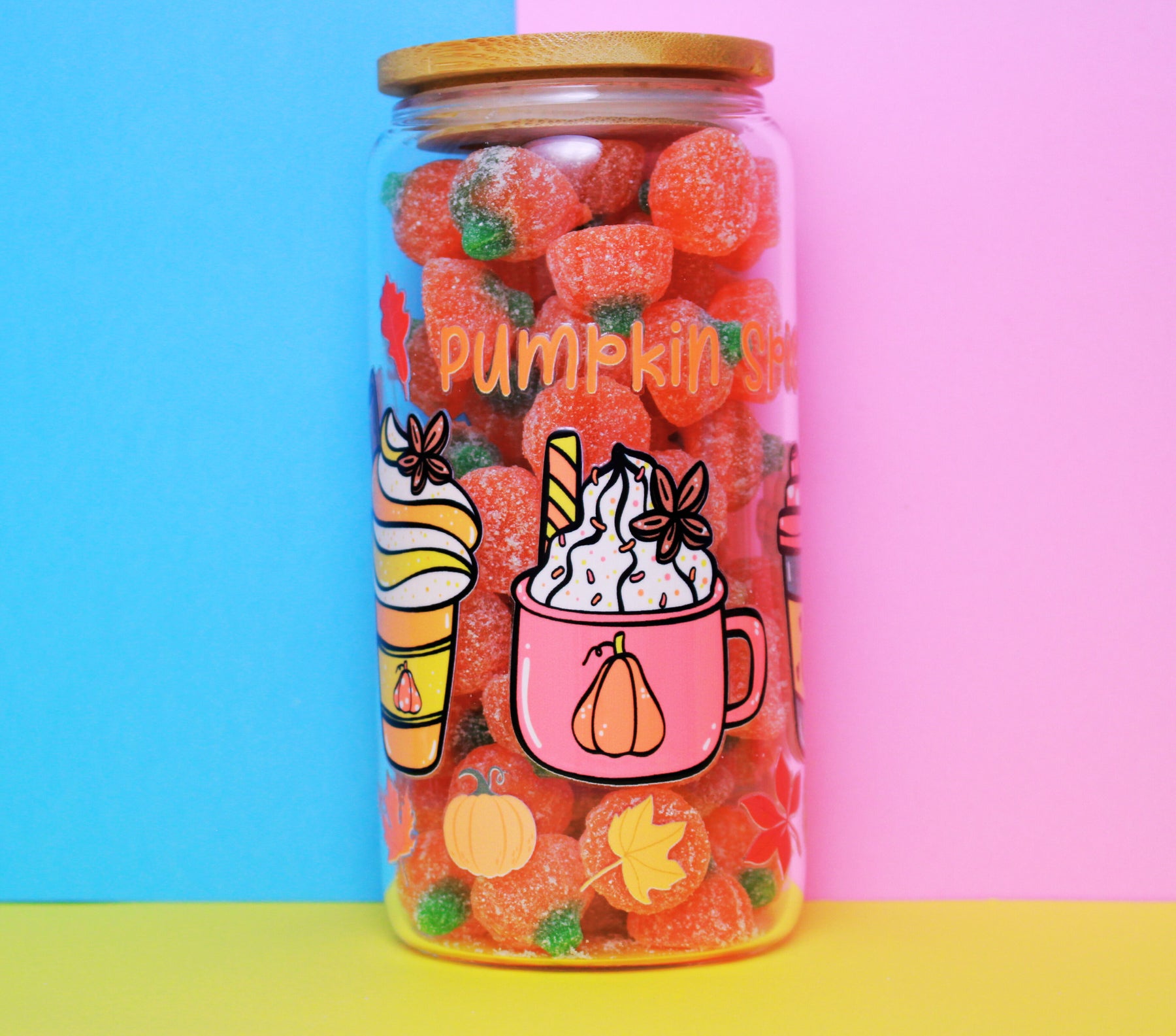 Autumn/Fall Customised 350g Vegan Pre-mix Sweets in Glass Cup with Bamboo Lid, Glass Straw & Choice of Wrap