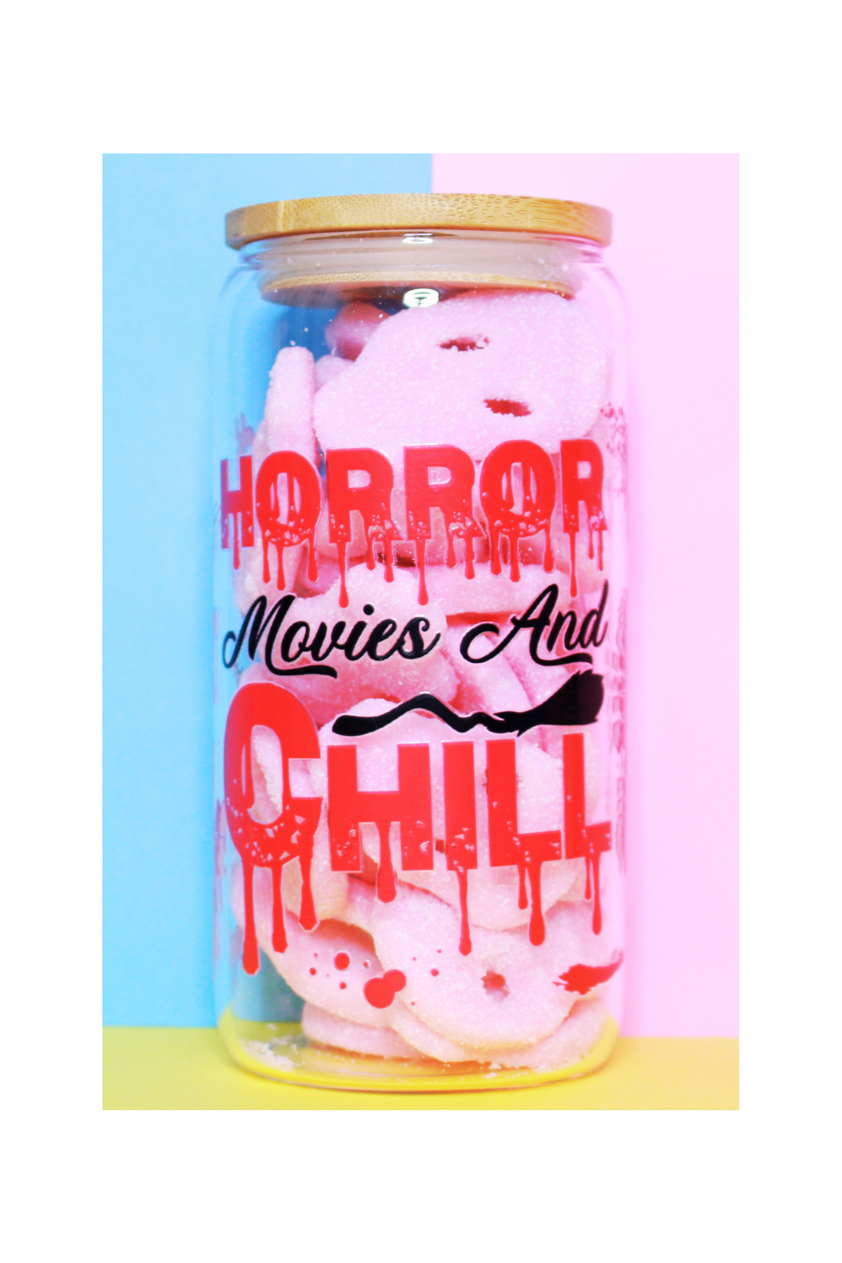 Halloween Customised 350g Vegan Pre-mix Sweets in Glass Cup with Bamboo Lid, Glass Straw & Choice of Wrap